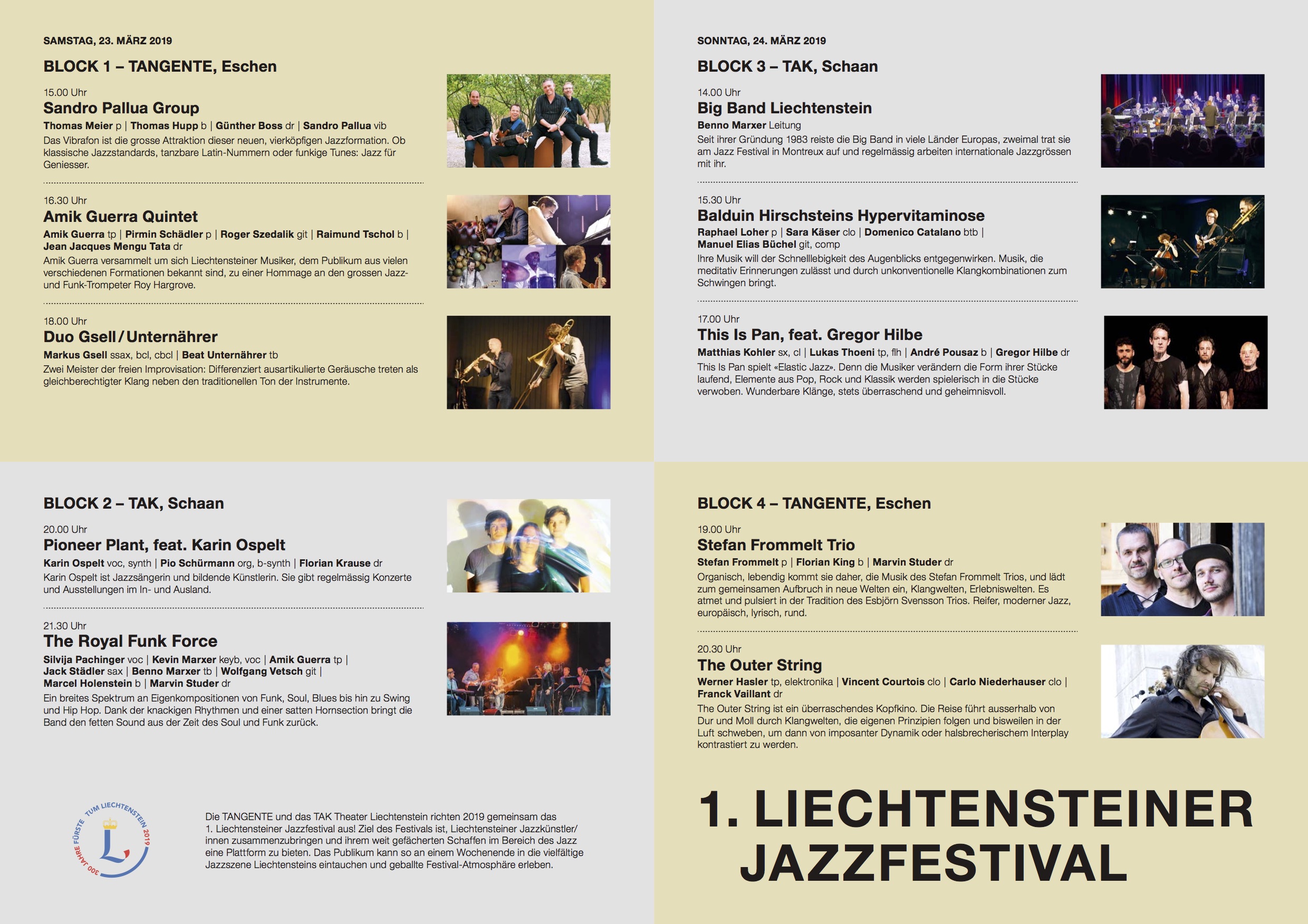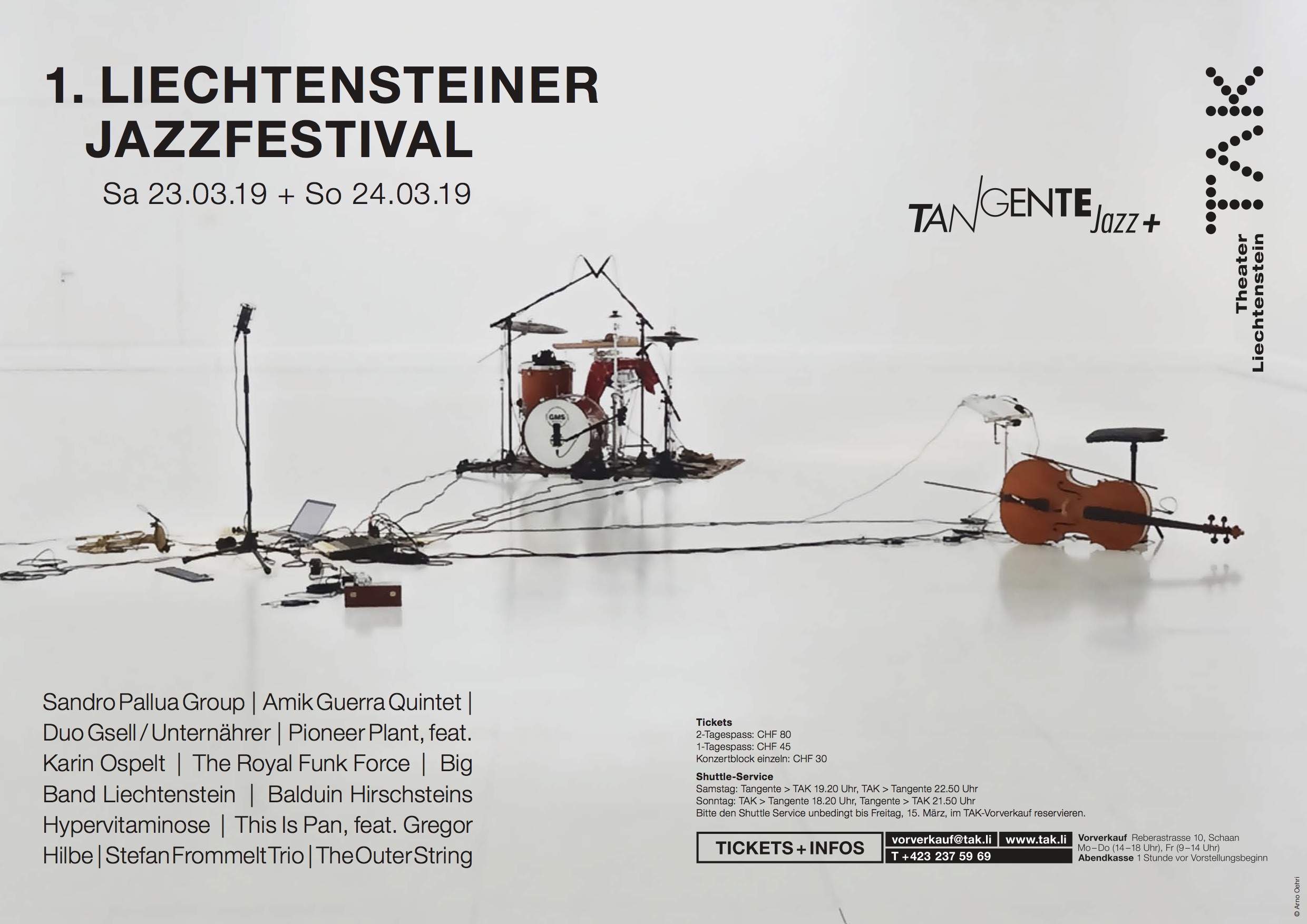Das TAK Theater Liechtenstein richtet in gemeinsamer Konzeption, Organisation und Durchführung mit der TANGENTE Eschen das 1. Liechtensteiner Jazzfestival aus! Mit dem Festival sollen erstmals die aktiven Liechtensteiner Jazzkünstler/innen an einem Wochenende zusammengebracht werden, um ihnen im weit gefächerten Schaffen im Bereich des Jazz eine Plattform zu bieten. Und das Schaffen der Liechtensteiner Jazzerinnen und Jazzer ist extrem vielseitig und vielschichtig. Das Publikum kann daher an einem Wochenende in die Jazzszene Liechtensteins eintauchen und geballte Festival-Atmosphäre erleben.