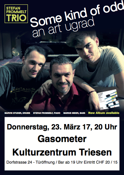 Stefan Frommelt Trio - Some Kind of Odd - An Art Ugrad - Contemporary Jazz made in Liechtenstein - live im Gasometer Triesen, Donnerstag, 23. März, 20hStefan Frommelt Trio (Stefan Frommelt, Florian King, Marvin Studer)